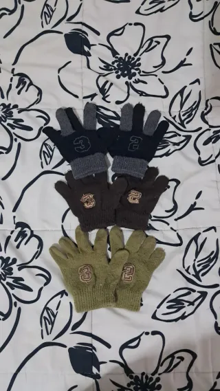 🧤 Conjunto de tres pares de guantes de invierno u otoño para chicos/niños 📍 Diseño con números '2' y '3' en tres colores: verde caqui, marrón oscuro y negro combinado con gris ✅️ En buen estado 🔎 Detalles: composición 94% acrílico 5% poliester 1% elastano