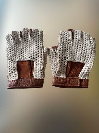 Guantes de conducción para hombre, combinando un diseño de crochet beige con detalles en piel. - Comprados en los años 80. - Parte superior de crochet transpirable. - Refuerzos de piel en la palma y muñeca. - Diseño sin dedos para mayor agarre. - Ancho palma mano 10,5 cm. Altura total 16 cm.