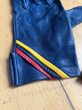 Auténticos guantes de piel del uniforme de Iberia de 1982. Diseñados para la tripulación de la aerolínea. - Material: Piel. - Color: Azul con detalles en rojo y amarillo.
