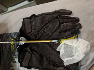 Guantes de piel para moto en talla L. Cuentan con un diseño moderno y detalles perforados para mayor transpirabilidad. Sin ningún uso, solo quitada la etiqueta. - Material: Piel - Talla: L - Cierre ajustable en muñeca - Diseño perforado - Protecciones interiores