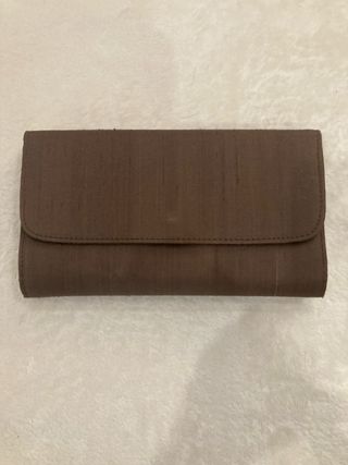 Bolso de mano en color marrón. - Material con acabado seda salvaje. - Diseño elegante con solapa. - Ideal para complementar tu atuendo. Con cadena para colgar. ideal para vestir y ceremonias. Se regalan guantes largos a juego.