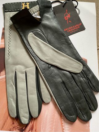 Elegantes guantes de piel y seda, perfectos para complementar tu atuendo. - Diseño bicolor en negro y gris. - Detalle de costuras decorativas. - Logo metálico en la muñeca.
