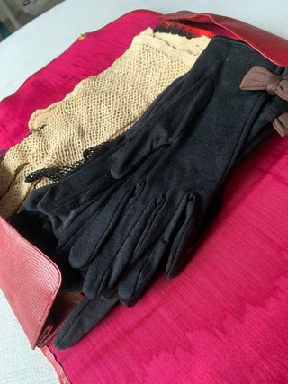 6 pares de guantes cortos y largos de estilo vintage, con un diseño delicado y de diferentes detalles como un pequeño lazo decorativo. Incluye bolsa de piel rojo burdeos con forro interior de moare de seda rosa - Diseño largo. - Detalle de lazo.