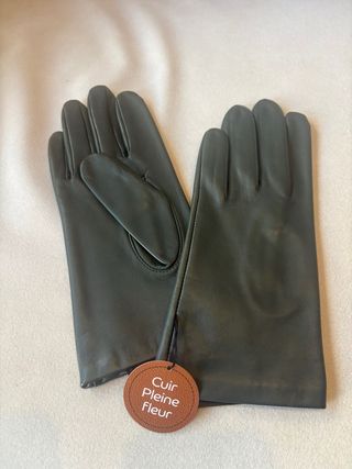 Elegantes guantes de piel para mujer. - Material: Piel con forro interior de seda. - Color: Verde oscuro. - Talla 7
