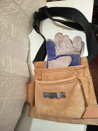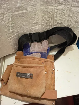 Riñonera de trabajo de cuero con cinturón ajustable. Incluye un par de guantes. - Material: Cuero - Color: Marrón y azul - Cierre de hebilla