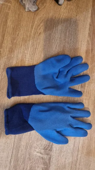 2 pares de guantes de trabajo, ideales para tareas de construcción o bricolaje. Diseñados para ofrecer protección y agarre. - Guantes de puntos de agarre azules en la palma y dedos. - Puño elástico con borde amarillo. Cada par 5€