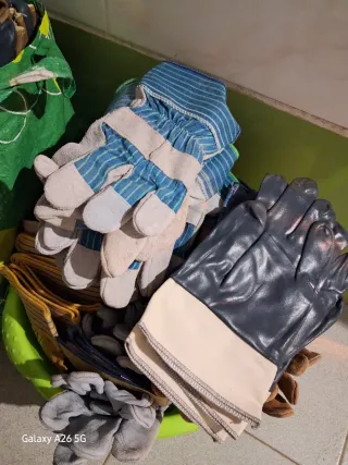 Lote de guantes de trabajo de diferentes tipos y colores. Ideales para proteger tus manos en diversas tareas. - Guantes de cuero. - Guantes de tela. - Guantes de protección.