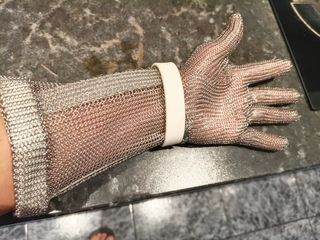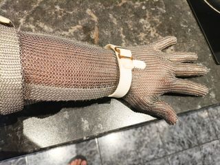 Guantes de malla metálica para protección. - Diseño de malla para mayor seguridad. - Cierre ajustable en la muñeca.