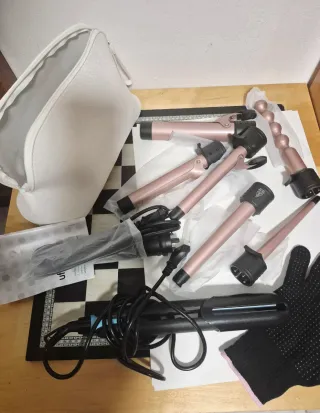 Set completo de rizadores con varios cabezales intercambiables (distintos tamaños y formas). Sirve para hacer desde ondas suaves hasta rizos estrechos, un montón de estilos con una sola herramienta. Ideal si te gusta cambiar de look sin comprar mil aparatos. Perfecta función: enchufa, espera a la temperatura deseada (la verás en el mango) y a trabajar. Incluyo guante por si te apetece darle la mano a la Antorcha Humana. Precio ajustado, está casi nuevo y además te llevas una plancha del pelo normal por la face✨ [Vendo porque me dejé el pelo largo por un cucaracho y recientemente meti tijeretazo. Libre soy, libre soy...]