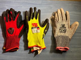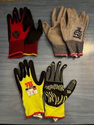 Lote de tres pares de guantes de trabajo. Ideales para diversas tareas. Logística. Almacén. Construcción. Mecánico. Ámbito laboral. Resistentes y cómodos. Uso para una correcta protección. Anticortes. Diseñados para ofrecer un buen agarre y protección en labores industriales. Guantes de seguridad, riesgos laborales. Gloves sintéticos para coworkers. - Guante rojo y negro, marca Adeepi, talla 7/S. - Guante amarillo con detalles negro y rojo, marca TB, 700F ZEBRA, talla 7. - Guante gris con detalles en negro y rosa en el puño, marca 3L International, catter 5 WX-40, talla 7. Estado: nuevos. Precio a pactar. Hago envíos.