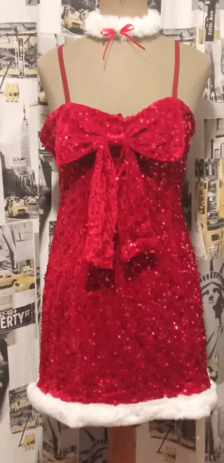 Vestido de fiesta con lentejuelas rojas. - Diseño con tirantes finos. - Adorno de lazo grande en el pecho. - Detalle de pelo blanco en el bajo. Compuesto por vestido, guantes y medias.