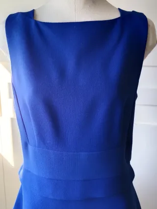 Vestido de corte clásico y elegante en un vibrante tono azulón. Perfecto para ocasiones especiales o para añadir un toque de sofisticación a tu armario. - Queda como un guante. - Diseño sin mangas. - Escote cuadrado. - Cintura marcada con detalle de banda.
