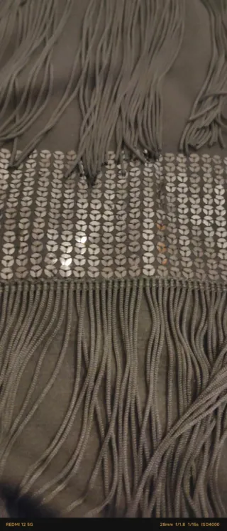 Vestido negro de Bershka con detalles de flecos estilo charlestón. Detalle lentejuelas. Talla pequeño. Las medidas son aproximadas. Se regalan guantes para completar el look. Algún detalle en los flecos , casi imperceptible, por lo delicado de los flecos. Solo 1 uso. - Diseño elegante y moderno. - Talla L.