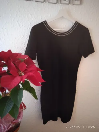 Vestido de punto ideal para eventos especiales. Su diseño elegante se realza con detalles de cristales en el cuello. - Tejido de punto. - Adorno de cristales en el escote.Delante y detrás . - Cómo un guante puesto. - Corto. - Talla 40/42.