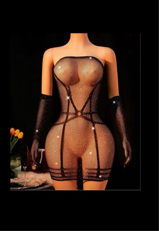 Este conjunto incluye un mini vestido transparente adornado con pedrería y unos guantes a juego. - Diseño de red. - Detalles de pedrería brillante. - Incluye guantes largos a juego.