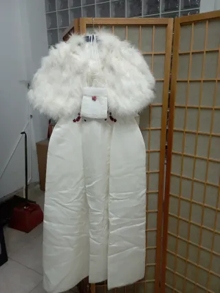 Conjunto de vestido de comunión blanco, acompañado de guantes y limonera