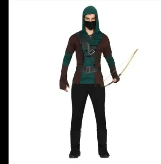 Disfraz de arquero con capucha y cinturón. - Incluye vestido, cinturón y guantes. - Diseño inspirado en Robin Hood.