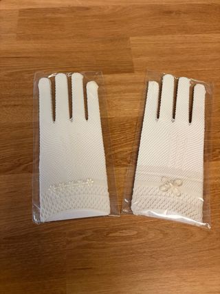 Par de guantes niña, ideales para el vestido de comunión . Presentan un diseño delicado con detalles florales. - Tejido de malla. - Adorno floral en el puño. hay 2 pares a elegir (uno en cada envoltorio) Disponible vestido de comunión nuevo pero sin etiqueta