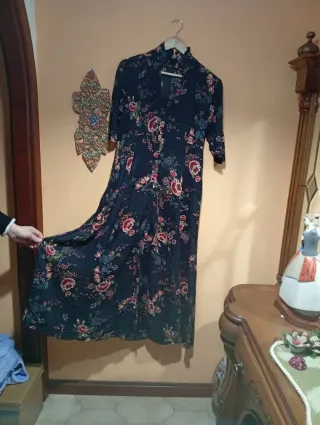 Vestido largo con un bonito estampado floral. Ideal para cualquier ocasión. - Diseño con cuello alto. - Mangas tres cuartos. - Falda con vuelo.Esta abierto por delante sienta como un guante