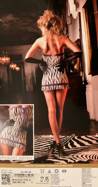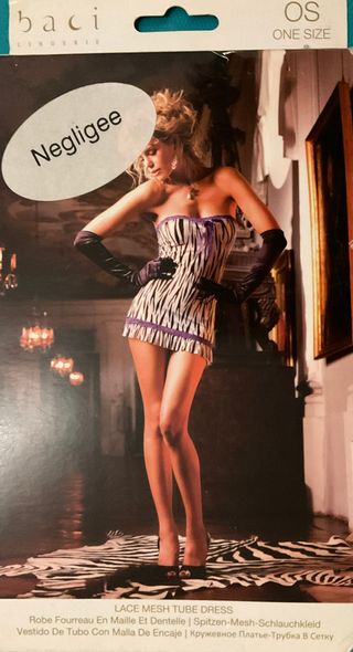 Vestido de tubo con malla y detalles de encaje. - Diseño llamativo con estampado de cebra. - Ribete morado en el escote y el bajo. - Incluye guantes largos a juego. Los artículos de lencería de más de 50 € tienen un 20 % de descuento. Liquidación de lencería; también se pueden recoger en Arta, 07570.