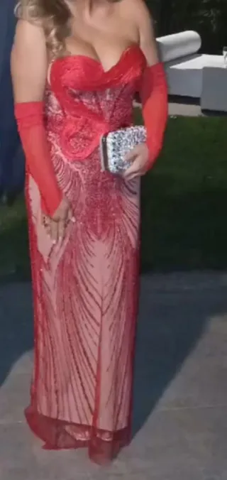 Elegante vestido largo de corte sirena, ideal para eventos especiales como bodas o fiestas flamencas. - Diseño strapless con escote corazón. - Adornado con pedrería y detalles de encaje. - Incluye guantes largos a juego.