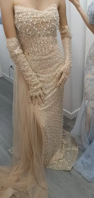 Elegante vestido largo de color beige, adornado con perlas y pedrería. - Diseño strapless. - Incluye guantes largos a juego. - Falda con abertura lateral. - Tejido de tul con forro. Esta nuevo lo pedi por internet y le esta un poco grande solo tengo esa foto porque esta el vestido guardado, cuaquier cosa venir y probar sin compromiso. Tiene etiqueta