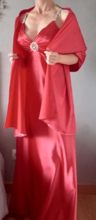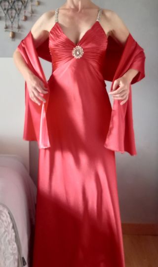 Usado en 2 ocasiones. En vestido pone talla XL pero yo uso la talla M y queda como un guante, sobre todo ajusta en pecho y cintura ya que cadera tiene más vuelo( ver fotos) 💞Precioso vestido largo de satén, ideal para eventos especiales como bodas o celebraciones. Es de color coral y tiene un diseño elegante y sofisticado. Viene con fular a juego. - Cierre con cremallera invisible. - Adornos con circonitas en tirantes y otras partes, copas preformadas. - Tejido fluido y suave. - Tiene un broche con cola que le otorga una elegancia única. Pecho: 90 cm Cintura: 72 cm Caderas: 93 cm Largo: 122 cm por delante sin contar cola (fotos)