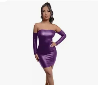 Vestido entallado y muy elástico con escote palabra de honor. Hombros al descubierto con mangas sujetas al vestido. Color morado eléctrico. Tela muy elástica. Se adapta como un guante. A estrenar. Talla L
