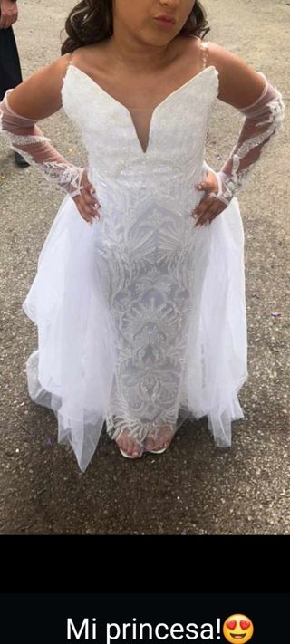Se vende vestido lleva cola de quitar i poner guantes i vestido todo de canutillos perlas se vende completo económico