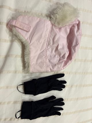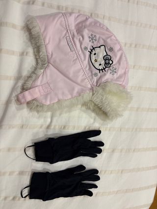 Gorro y guantes para el frío. - Gorro rosa con detalles de Hello Kitty y copos de nieve, forro interior de pelo sintético blanco.3€ - Guantes negros decathlón, para poner debajo de guantes de esquí, son muy finos. 1€