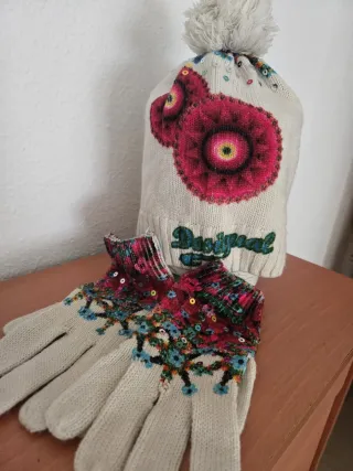 Conjunto de gorro y guantes de la marca Desigual. - Gorro de lana con pompón y detalles de lentejuelas. - Guantes a juego con diseño floral y lentejuelas.