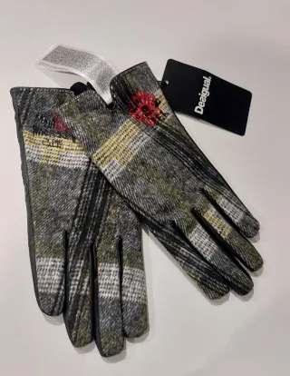 Elegantes guantes de la marca Desigual con un diseño a cuadros y detalle de flores bordadas. - Diseño a cuadros en tonos grises y amarillos. - Flores bordadas en color rojo. - Acabado exterior en tela y detalles en piel.