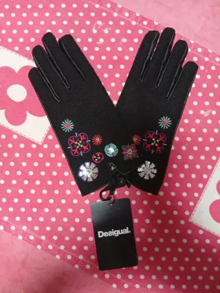Elegantes guantes de la marca Desigual, perfectos para añadir un toque especial a tu atuendo. Como su propio nombre indica, son desiguales. Adornados con pedrería en la parte superior de uno de ellos y el otro multicolor. Talla M.