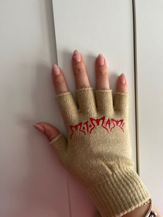 Guantes sin dedos con un diseño único. - Color base beige-tostado - Detalle logo en color rojo. DISPONIBLE SOLO PARA ENVIOS Envio en 24 horas #motomami #rosalia