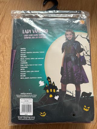 Disfraz infantil de Lady Vampiro, perfecto para fiestas de disfraces o Halloween. Incluye vestido, guantes, esclavina y bolso. - Talla L (8-10 años). - Diseño de vampiro. - Incluye accesorios.