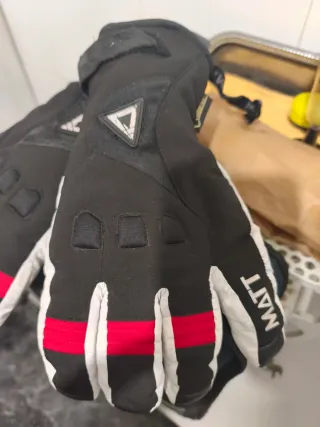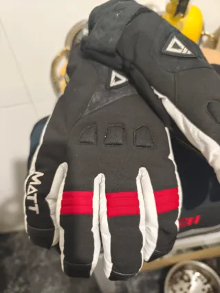 Guantes de la marca Matt con un diseño llamativo. - Combinación de colores negro y rojo. - Detalle de logo triangular en la parte superior. - Cierre de velcro en la muñeca.