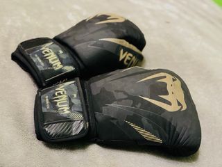Par de guantes de boxeo Venum con diseño de camuflaje y detalles dorados. - Cierre de velcro. - Logo de Venum en la muñeca. - Estampado de camuflaje.
