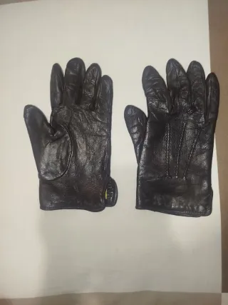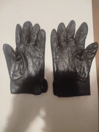Elegantes guantes de cuero en un bonito tono azul marino. Perfectos para añadir un toque de estilo. - Material: Cuero genuino. - Diseño con pequeños detalles perforados. - Cierre en la muñeca. - Por dentro son de tela suave calentita (diría que piel de conejo). - Talla diría que una M. - Quedan entallados.