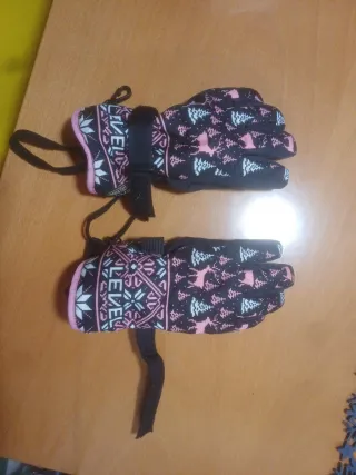 Guantes de nieve marca Level para niña con un divertido estampado, muy poco uso. - Diseño con renos y árboles. - Cierre de velcro ajustable. - Cuerda de seguridad.