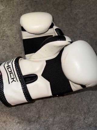 Guantes de boxeo Outshock en blanco y negro. Son una pareja de guantes prácticamente nuevos, con mínimos signos de uso. - Ideales para entrenamiento. - Diseño moderno y cómodo. - Material resistente y duradero.