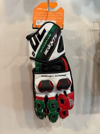 Guantes de moto Seventy, modelo SD-R2. Diseñados para carreras. - Combinación de colores blanco, verde, rojo y negro. - Detalle Breaking the Limits en la muñeca. - Protecciones integradas en nudillos y dedos. 🛑Talla M y L