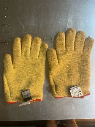 Par de guantes de protección térmica. - Material resistente al calor. - Color amarillo brillante. - Borde rojo en los puños. Talla : 9,5
