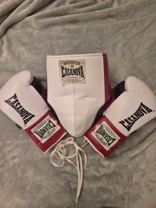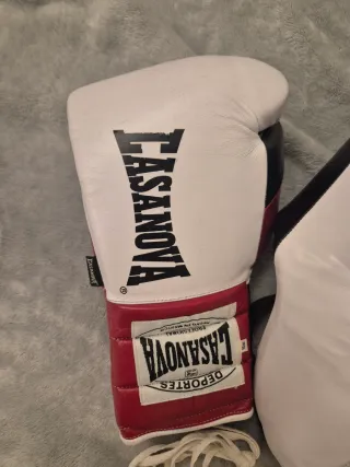 Par de guantes de boxeo Casanova. - Color blanco y rojo. - Cierre con cordones.
