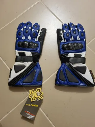 Guantes de moto de alta calidad, talla L. - Fabricados con cuero genuino. - Incorporan protecciones de carbono en los nudillos. - Cuentan con tecnología Kevlar y Schoeller. - Cierre ajustable en la muñeca.