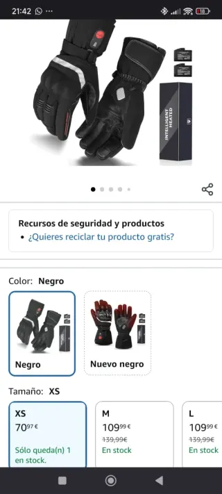 Guantes de talla XL en color negro. Sin estrenar Llevan 2 baterías, con su cable doble para recargarlas a la vez 3 posiciones de calor. Los vendo, porque fueron un regalo, y me van grandes.