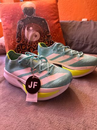 Zapatillas de running Adidas Adizero Prime X3 Strung en color verde azulado y blanco. Diseñadas para ofrecer un rendimiento óptimo. - Parte superior con tecnología Strung. - Mediasuela con amortiguación. - Suela exterior para tracción.