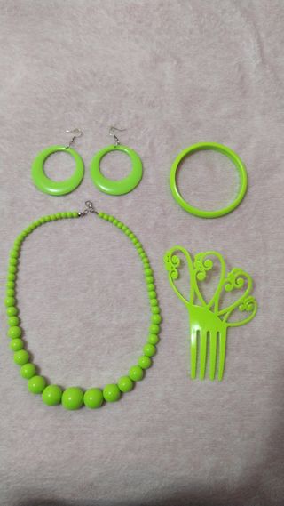 Conjunto de accesorios de joyería en llamativo color verde. - Collar de cuentas de varios tamaños. - Pendientes de aro grandes. - Pulsera rígida. - Peineta decorativa con diseño.