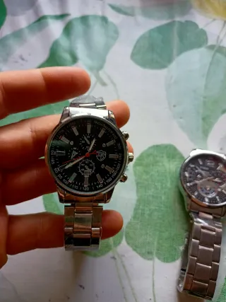 Conjunto de tres relojes con un diseño elegante y moderno. - Brazalete de metal plateado. - Esferas con detalles en negro y plateado. Sin estrenar como se ve en las fotos que todavía tienen los plásticos originales.15e cada uno y 40 si te llevas los 3.