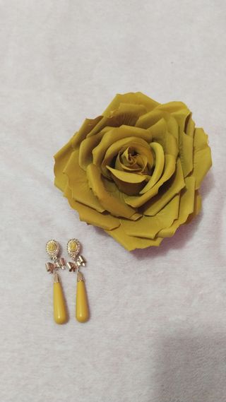 Conjunto de flor decorativa y pendientes a juego. - Pendientes con diseño de lazo y colgante. - Flor de tela con pétalos detallados.