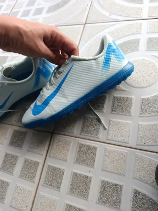 Zapatillas de fútbol con un diseño moderno y llamativo. - Combinación de colores azul y blanco. - Marca Nike.